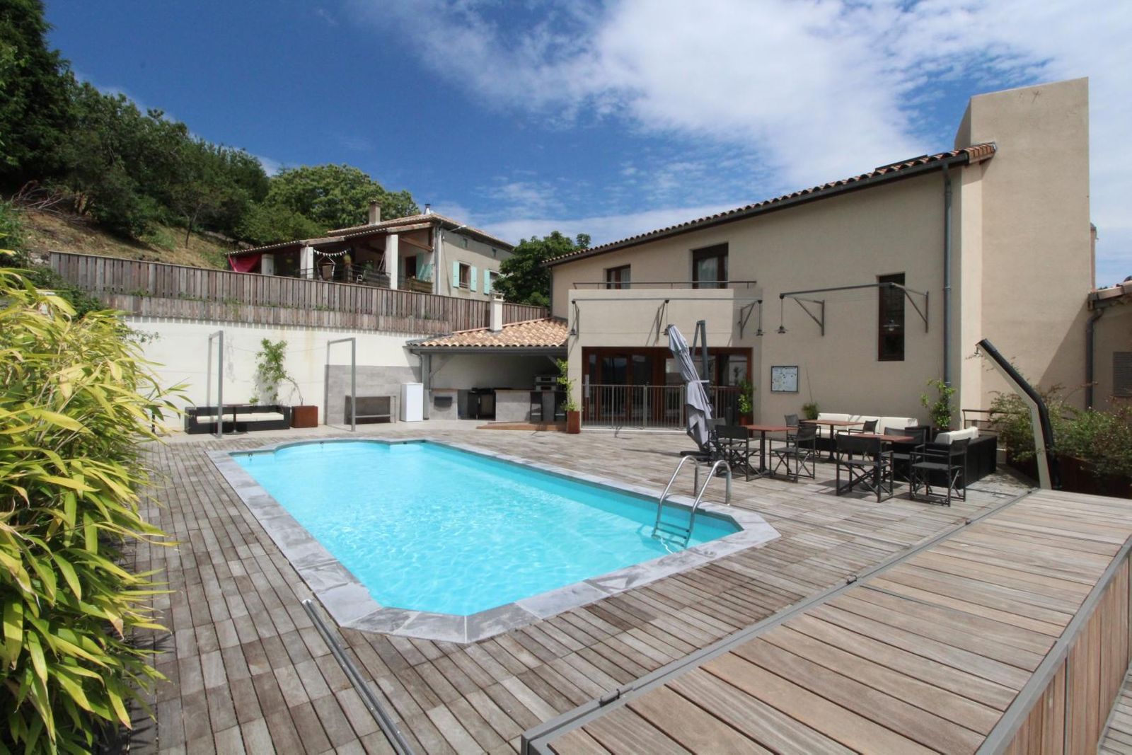 Avec une capacité de 61 personnes réparties sur deux bâtiments, il propose 17 chambres de 2 à 8 personnes, la plupart avec salle d'eau privative. Vous y trouverez une grande salle à manger, une salle multi-activités avec bar et sonorisation, une cuisine professionnelle, une salle de jeux pour enfants, une salle de travail ainsi qu'un espace bien-être avec sauna. La terrasse entourant la piscine* dispose d'une cuisine d'été équipée de planchas, de fours à pizza et d'un évier.